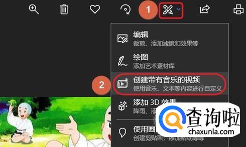 这样即可通过照片查看器浏览到这张图片了,在软件的右上角点击创意图标,然后在下拉菜单里找到“创建带有音乐的视频”,如下图;