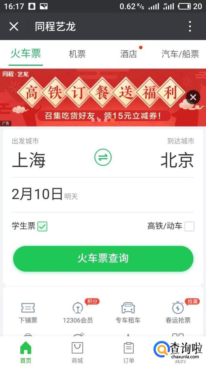 点击进入机票火车票按钮,然后购买火车票时勾选学生票就OK啦。