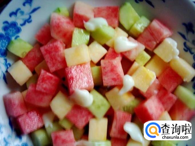 选择自己喜欢吃的水果,清洗干净,切成丁。