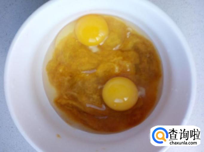 在装有芒果肉的碗里,打入两个鸡蛋。