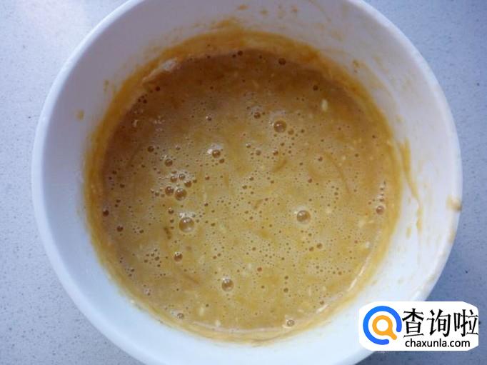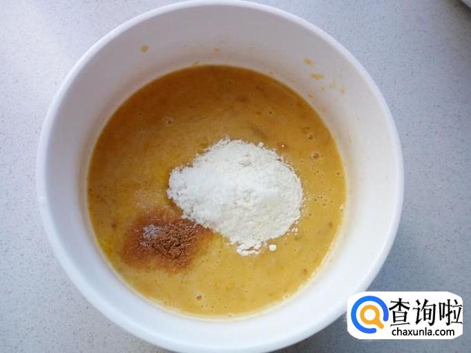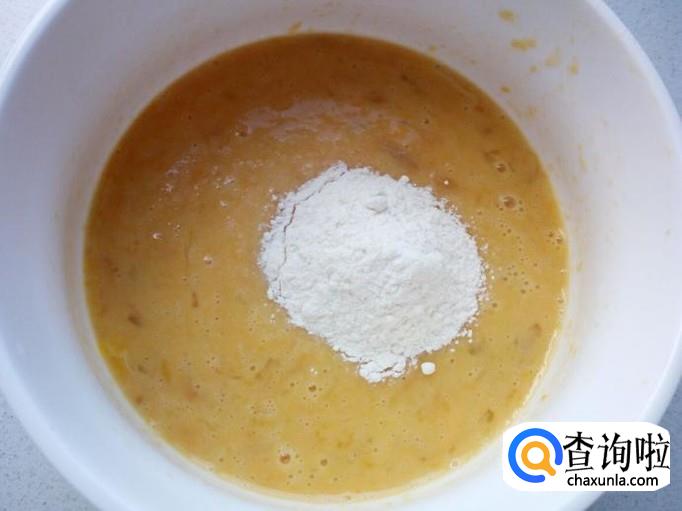 在搅拌均匀的芒果鸡蛋液里,先放入一匙儿面粉(面粉要逐步添加,不要一次放多,避免面粉过厚,我总共放了两匙儿)。