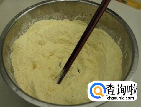 将玉米面和豆面放入盆中,再放入白糖和温水,水要试着放,边搅拌边放,并且用筷子顺时针搅拌。