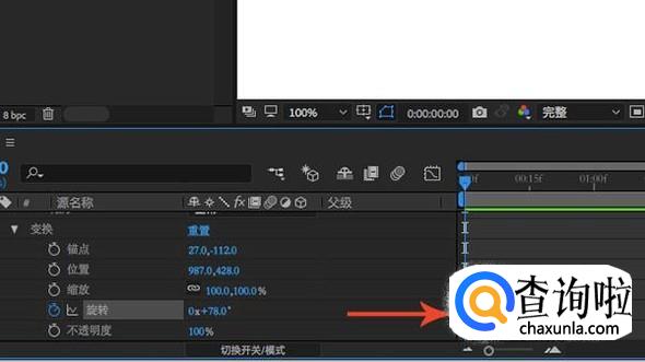 接下来开始设置动效,在开始的位置打上关键帧,将旋转角度数值往左进行设置。