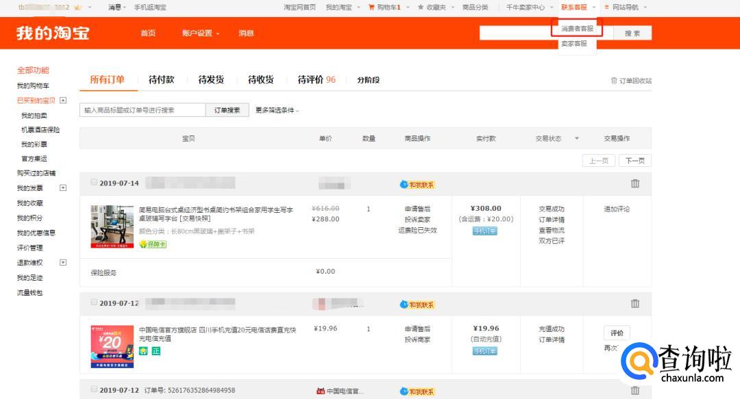 进入个人购物明细页面后,在页面最上方会看到一个“联系客服”选项,把鼠标移到按钮上,会出现下拉列表,点击【消费者客服】可进入买家客服页面。