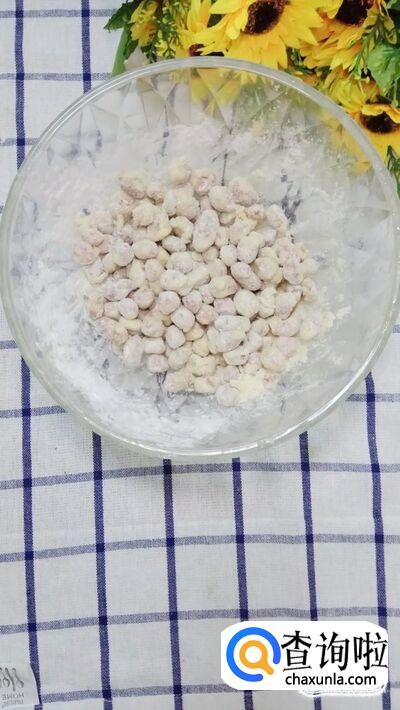 搅拌成如下图所示的样子,让每一个花生都均匀的裹上一层淀粉,一粒一粒尽量分开。