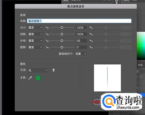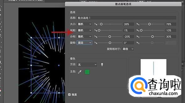 添加画笔之后按回车键进入散点画笔选项设置界面,将旋转相对于选择为“路径”,然后将大小、间距以及分布设置为随机,根据预览效果调整数值即可。