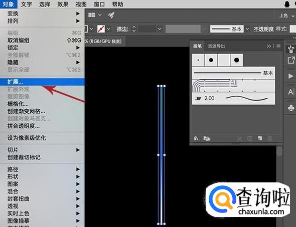 接着点击渐变线条,在上方菜单中选择“对象-扩展”,对形状进行连续两次扩展操作。