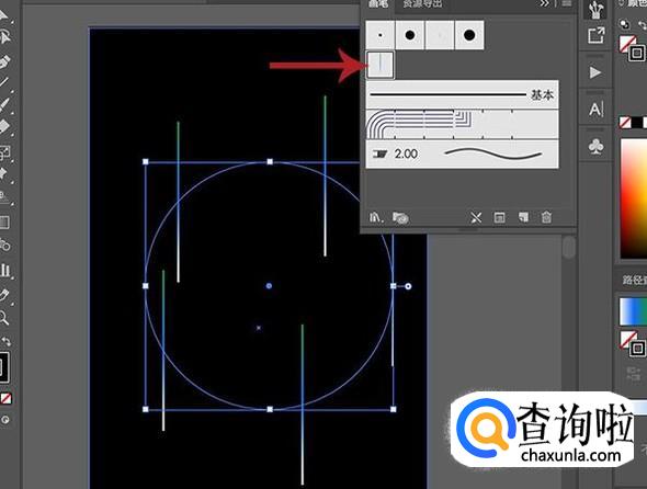 接着点选圆形图层,然后在画笔中点击我们刚才添加进去的炫彩线条画笔。