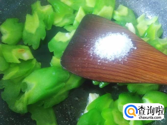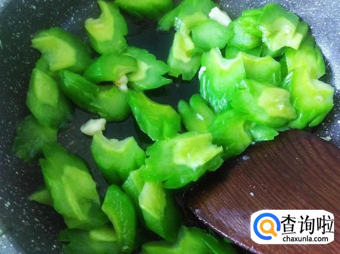 再开火下油,放蒜米进去爆出味来,苦瓜回锅加适量的盐。