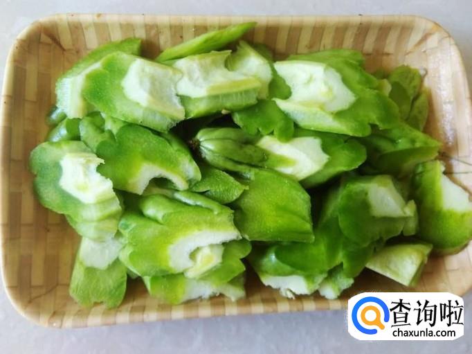 首先把苦瓜清洗干净,然后切开去籽,再侧刀切成一块块。