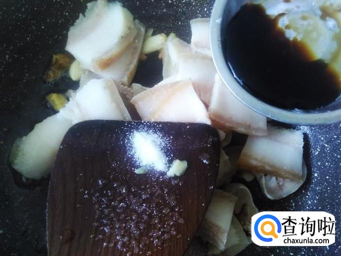 再开火下油,放蒜米、姜蓉进去爆香,然后放猪头皮进去加适量的生抽。