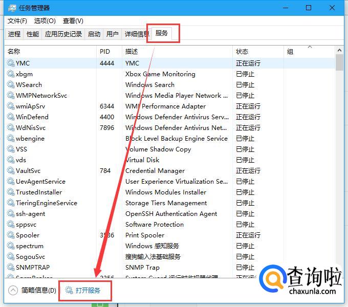 打开“任务管理器”窗口,单击“服务”选项卡,单击“打开服务”按钮,如下图所示。
