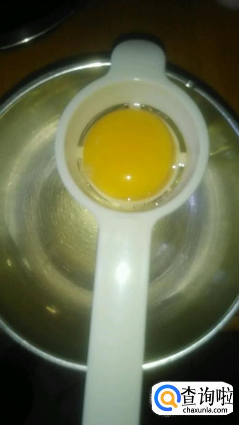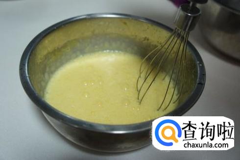 蛋白蛋黄分开。蛋黄里加入20g白糖搅拌均匀,慢慢加入植物油用刮棒将其乳化,再加入牛奶,慢慢搅拌。