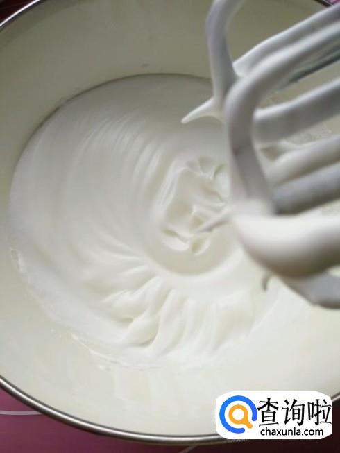 蛋白加入40g白糖打至硬性发泡。(提起电动打蛋器有倒三角形成且不消失即可)