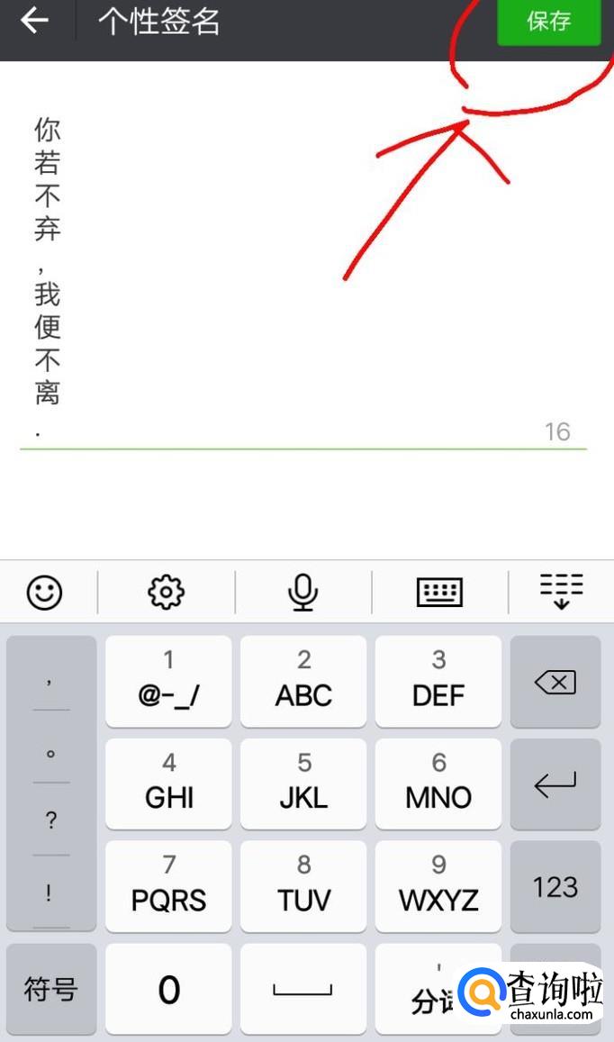 此时看到的是横着的个性签名,将其删除,然后输入一个字,点击下回车键,直到输入到最后一个字为止。最后点击保存即可
