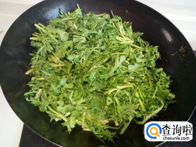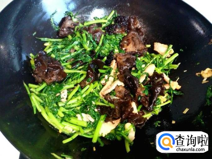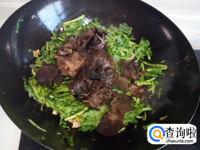 茼蒿略翻炒一下,放入焯好的木耳,放入盐。炒至茼蒿断生,放入味精,关火出勺。
