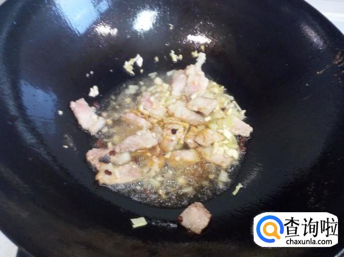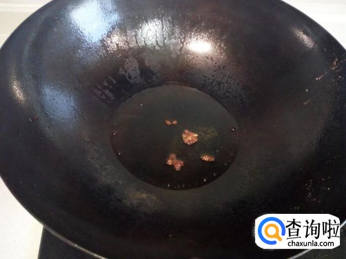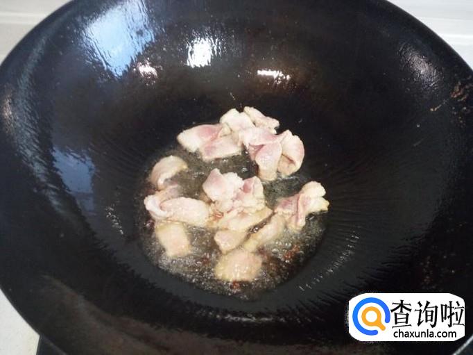 锅里放入油加热,油热后放入花椒爆锅,放入肉翻炒。