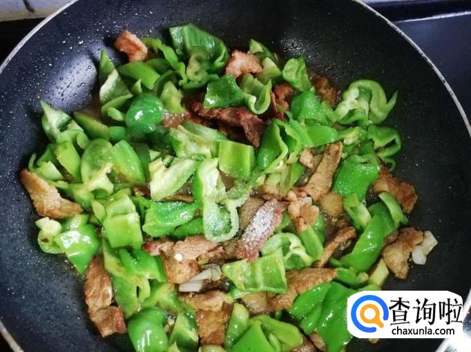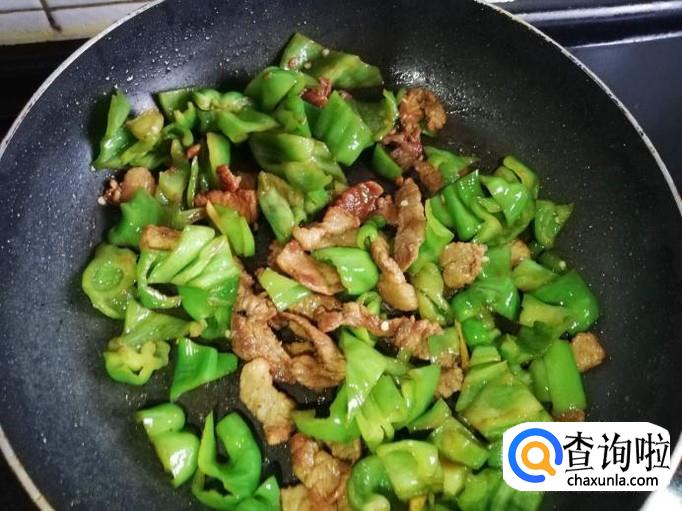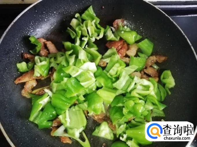 青椒放入锅中大火翻炒,炒至青椒断生