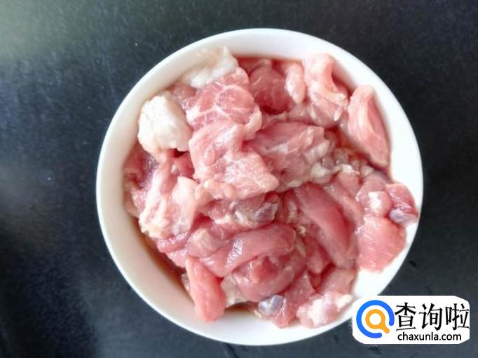 将猪肉洗干净,切成片,然后倒入少许黄酒抓匀,腌制10分钟