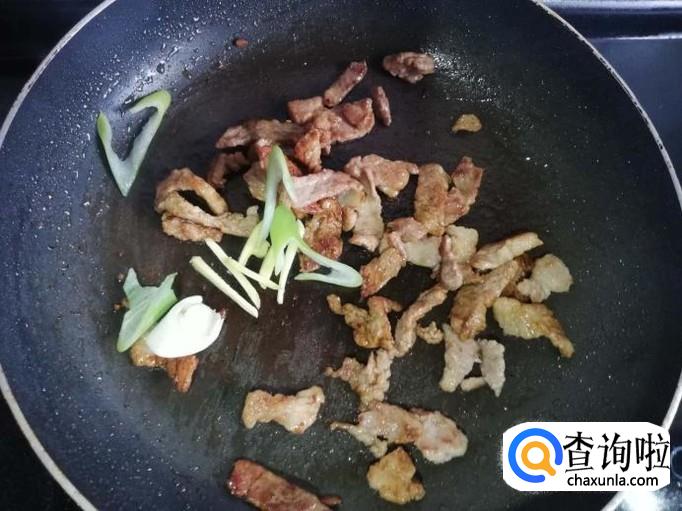 肉片炒至变色后,下入 姜、 大葱翻炒