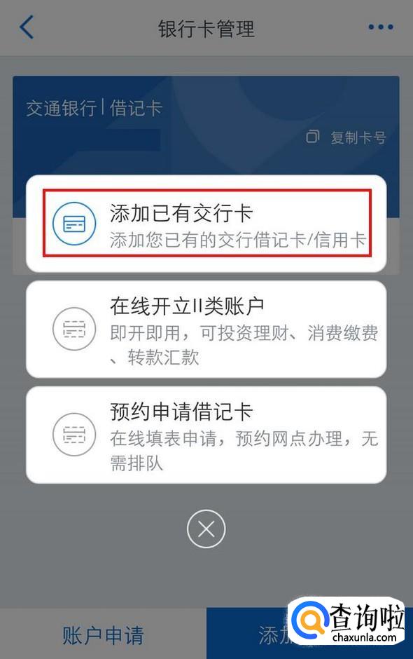 选择“添加已有交行卡”,包含借记卡和信用卡;