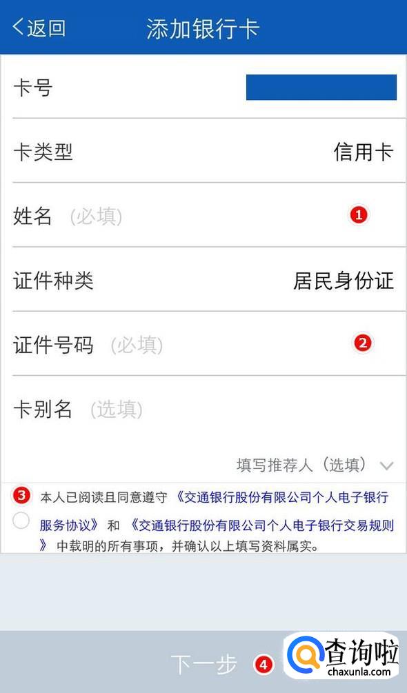 输入姓名和身份证号,卡别名可选填,选择遵守协议和规则,点击下一步;
