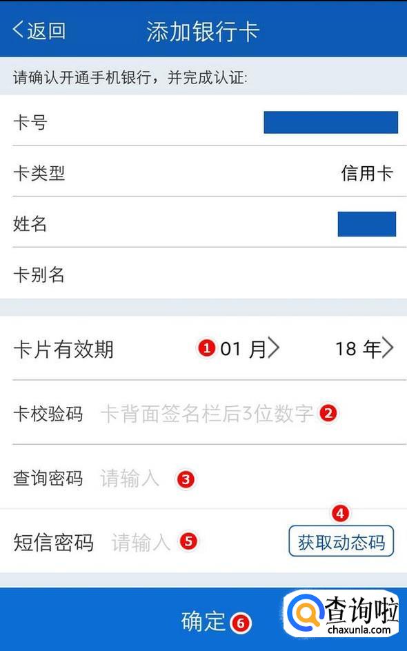 选择卡片有效期,输入卡校验码、查询密码和短信动态码,点击确认;