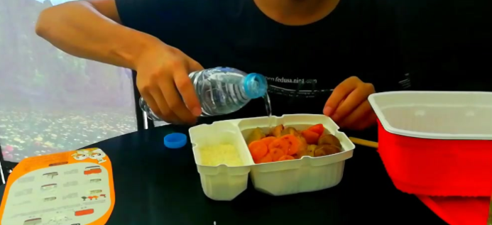 5、然后快速将饭盒放在发热包上,盖好盒盖(像原来那样扣上,因几秒钟即发热,小心烫手);再将菜包放在盒盖上,一会翻动几下,并用手挤捏,以便菜包受热均匀;
