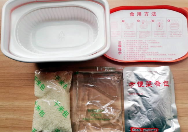 1、撕开收缩膜,抽出纸盒,打开外盖取出菜包、菜饭盒、发热包、餐具及水袋;