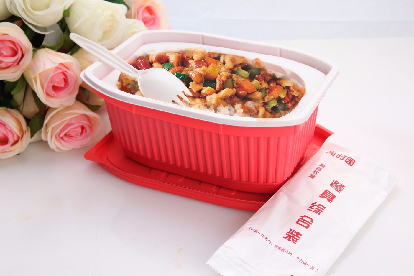 6、稍等8分钟(冬天10分钟),撕开菜包,将菜肴均匀倒在米饭上。即可享用热气腾腾的美味佳肴。