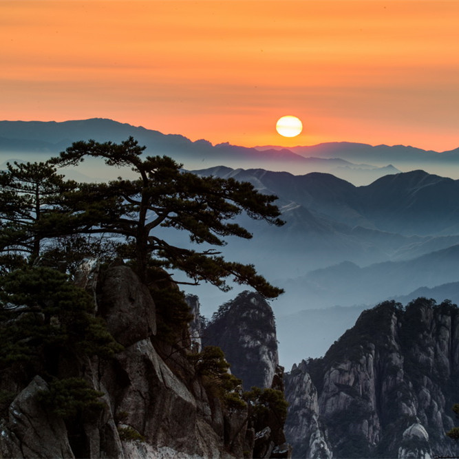 黄山原名“黟山”,因峰岩青黑,遥望苍黛而名。后因传说轩辕黄帝曾在此炼丹,故改名为“黄山”。黄山代表景观有“四绝三瀑”,四绝:奇松、怪石、云海、温泉;三瀑:人字瀑、百丈泉、九龙瀑。黄山迎客松是安徽人民热情友好的象征,承载着拥抱世界的东方礼仪文化。
