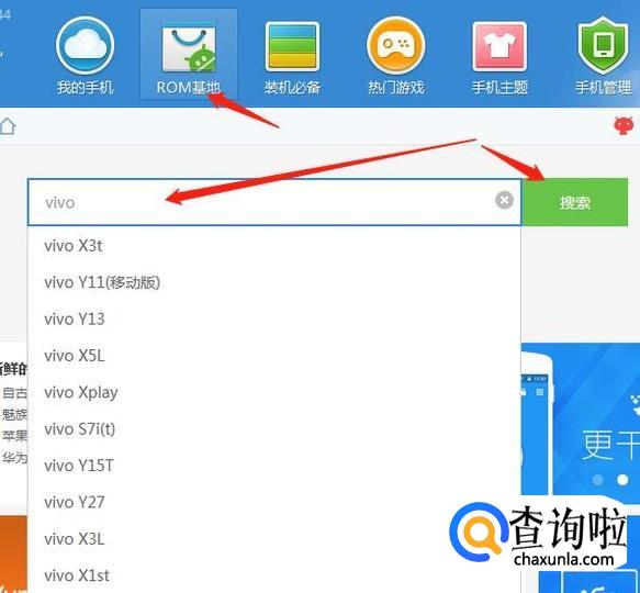手机连接成功后,我们在点击顶部的“rom基地”通过搜索的方式快速查找我们的机型rom。