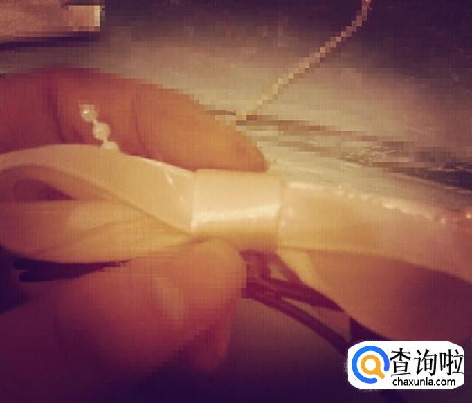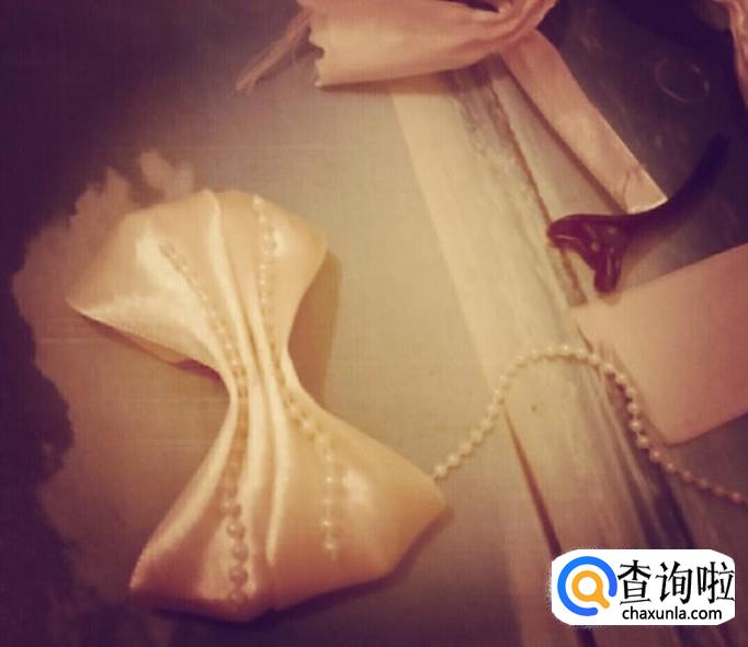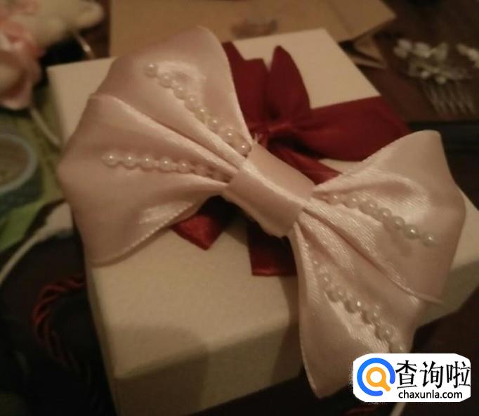 剪两节比蝴蝶结略短一点的小珠子粘在蝴蝶结上。