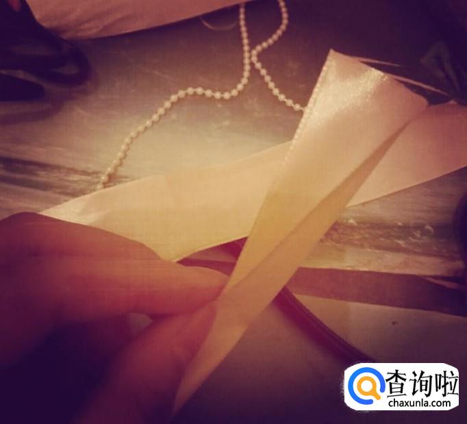 然后我们把丝带从中间对折,把两边翻折过来,如下图。
