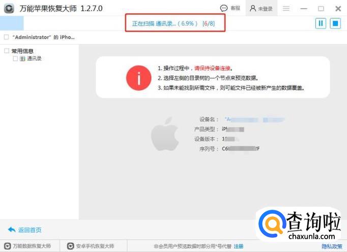 点击开始扫描,进入扫描,通讯录扫描的时间是比较快的,所以大家稍等片刻。