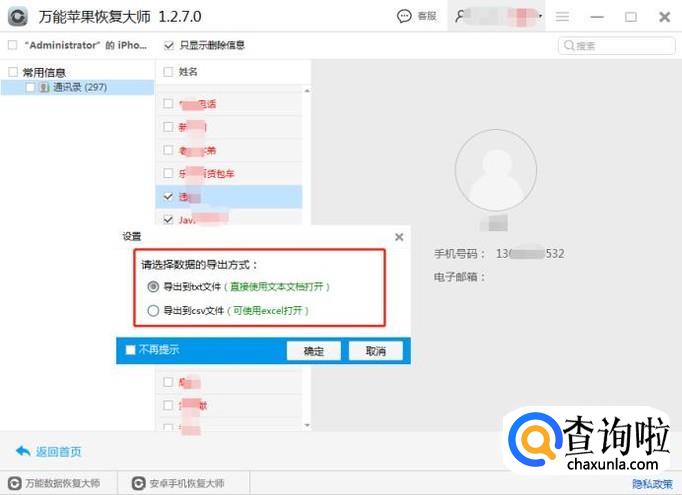 完成扫描后,进入查看手机通讯录,可以勾选上方“只显示已删除的数据”即可,找到自己要的通讯录,点击恢复按钮,选择输出格式,可以选择TXT格式也可以选择Excel格式,之后点击确定保存到电脑上。