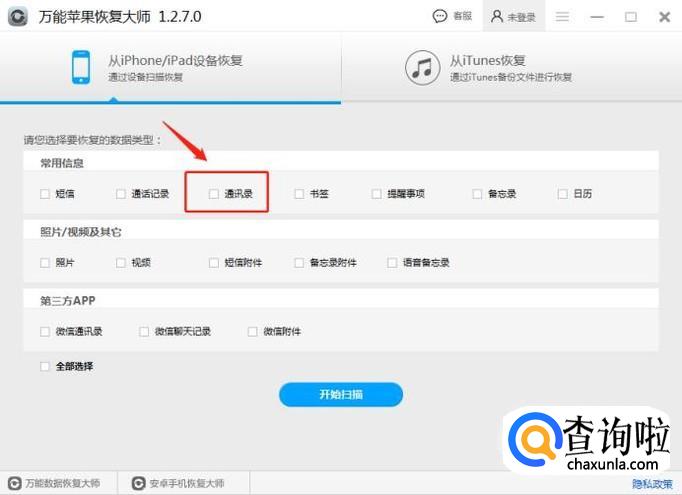 连接iPhone手机后,软件也会识别到,选择从iPhone设备扫描恢复模式,并进入选择数据的类型,勾选“通讯录”。