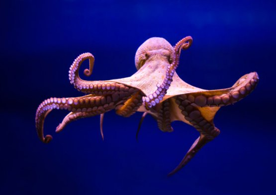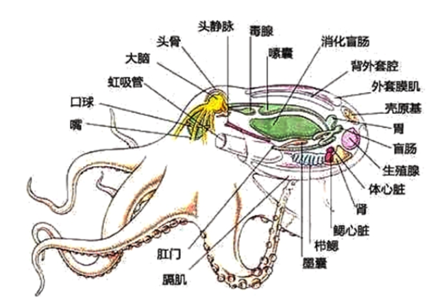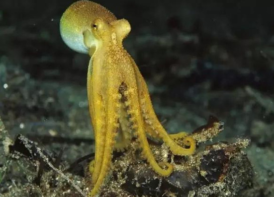 其实,章鱼的脑袋并不那么大,我们所看到的脑袋大部分是躯体,科学家解剖以后发现,里面藏着全部内脏,包括鳃、胃、肝、肾及墨囊等器官。章鱼的头长在眼睛后面的身体里,我们看不见,才误以为它的躯体就是脑袋。
