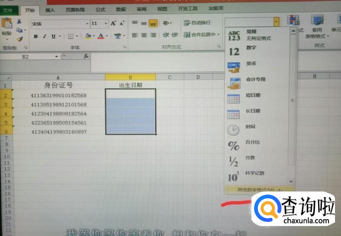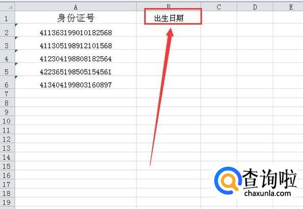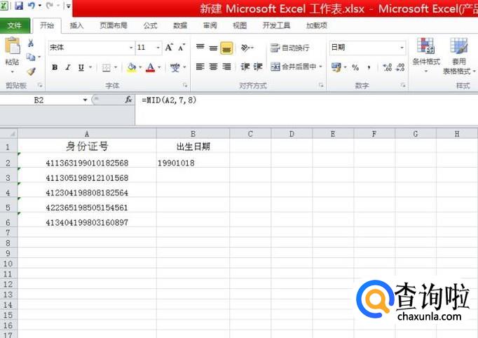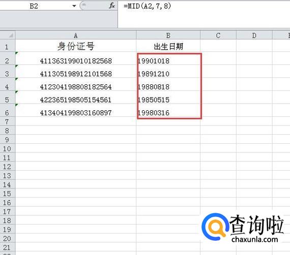 选中B2,输入=MID(A2,7,8),这个函数的意思是把A2中的数据从第七位开始截取,截取至第八位,点击回车键,就会出现相应的出生日期。之后下拉到最后一列即可。