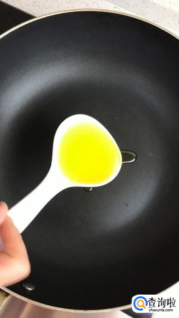 接着在平底锅中加入适量的食用油,把油烧热,如下图所示。
