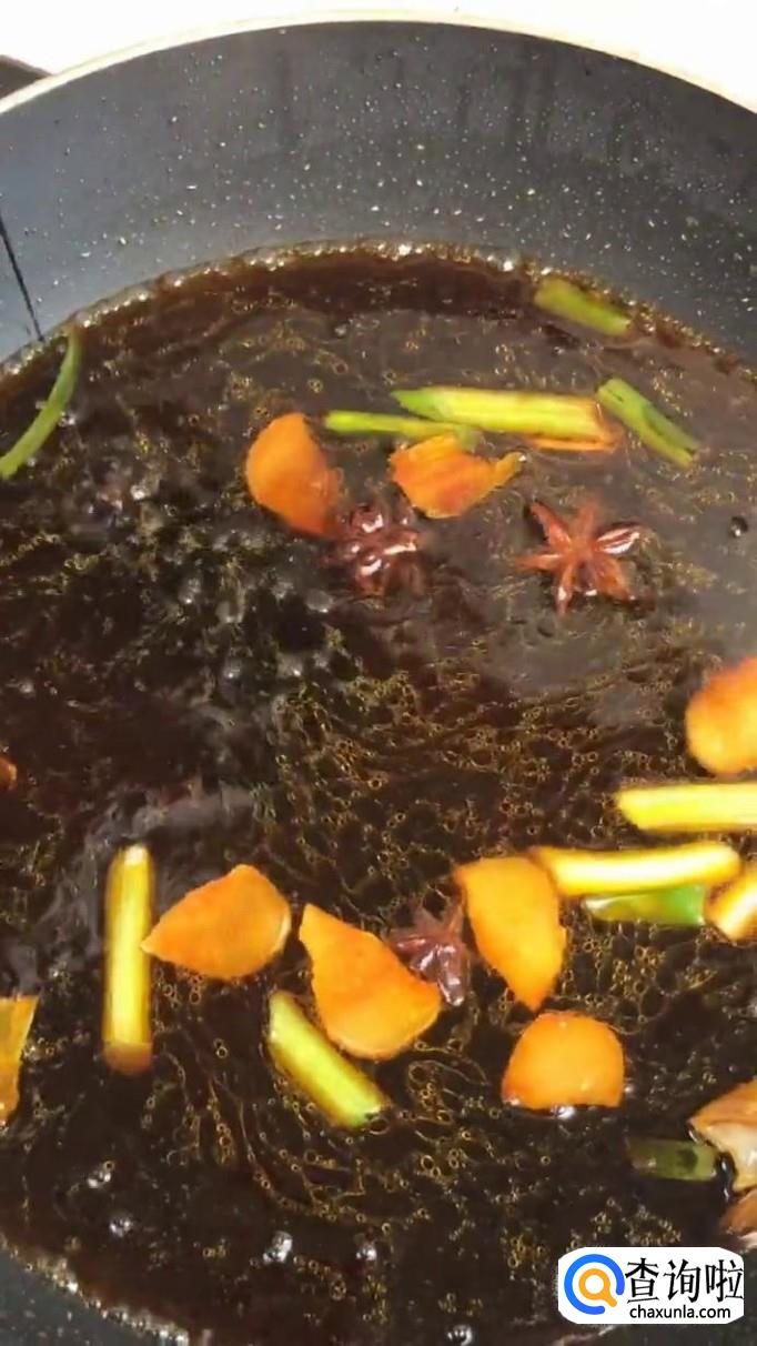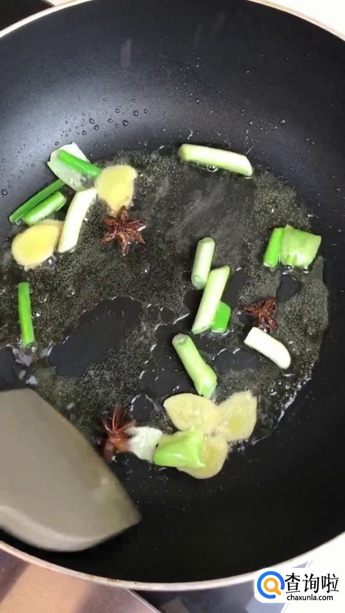 然后往加入蒜头,大葱和八角爆香,如下图所示。