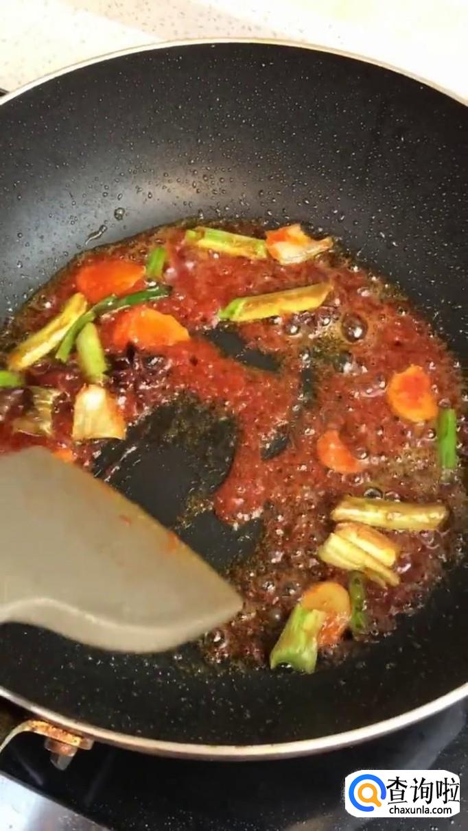 接着往锅中加入适量的番茄酱炒匀,如下图所示。