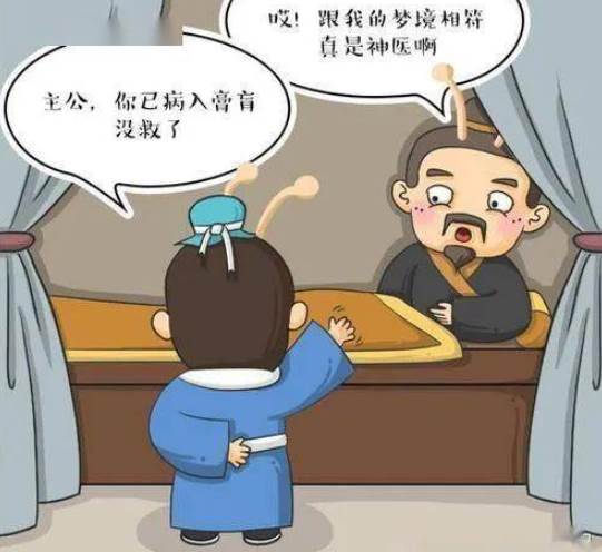 晋景公病重,到秦国请医生。秦桓公派医缓给晋景公诊病。医缓还没有到达,晋景公又梦见疾病变成两个小儿童,一个说:“他是个好医生,恐怕会伤害我们,往哪儿逃好?”另一个说:“我们待在肓的上边,膏的下边,拿我们怎么办?”医生来了,说:“病不能治了,病在肓的上边,膏的下边,灸不能用,针达不到,药物的力量也达不到了,不能治了。”晋景公说:“真是好医生啊。”于是馈送给他丰厚的礼物让他回去。