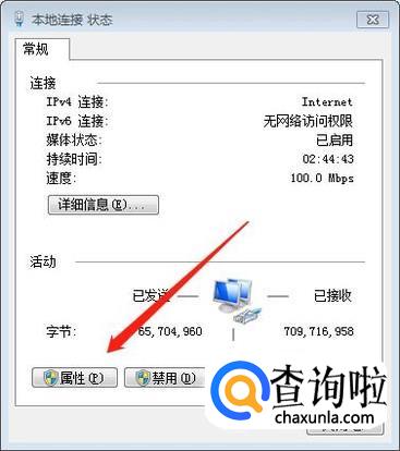 进入“网络和共享中心”后我们点击“本地连接”进入后会弹出窗口,我们点击“属性”进入。