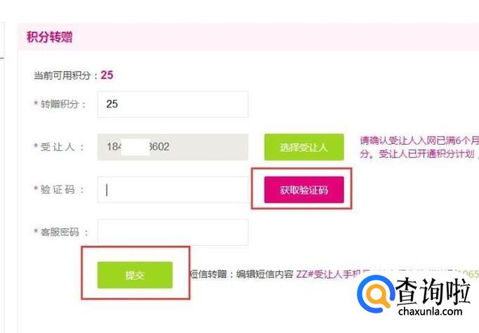 最后,我们输入手机验证码和服务密码,点击“提交”按钮,这样积分就成功转让了。