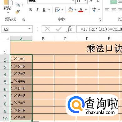 接着,在A2单元格输入公式:=IF(ROW(A1)>=COLUMN(A1),COLUMN(A1)&"×"&ROW(A1)&"="&ROW(A1)*COLUMN(A1),"")