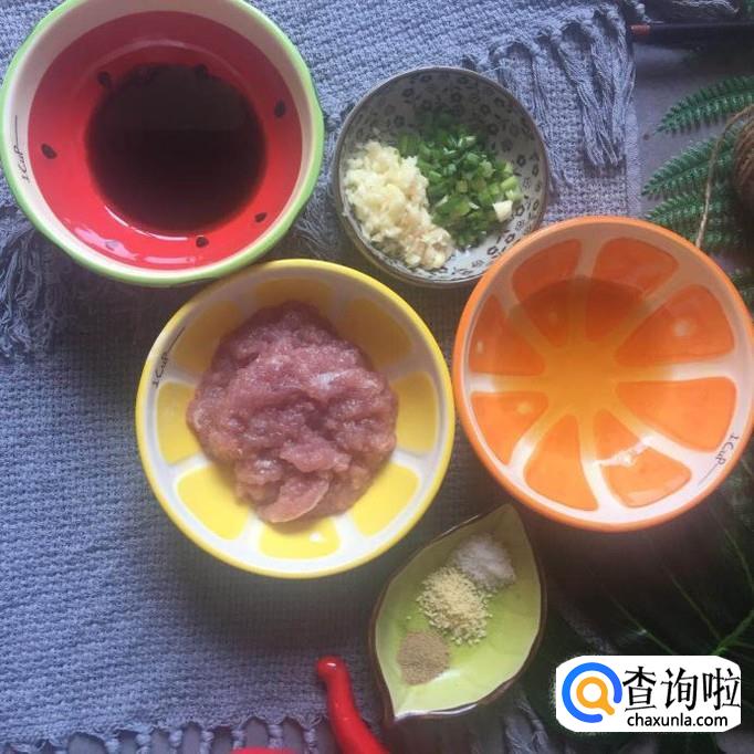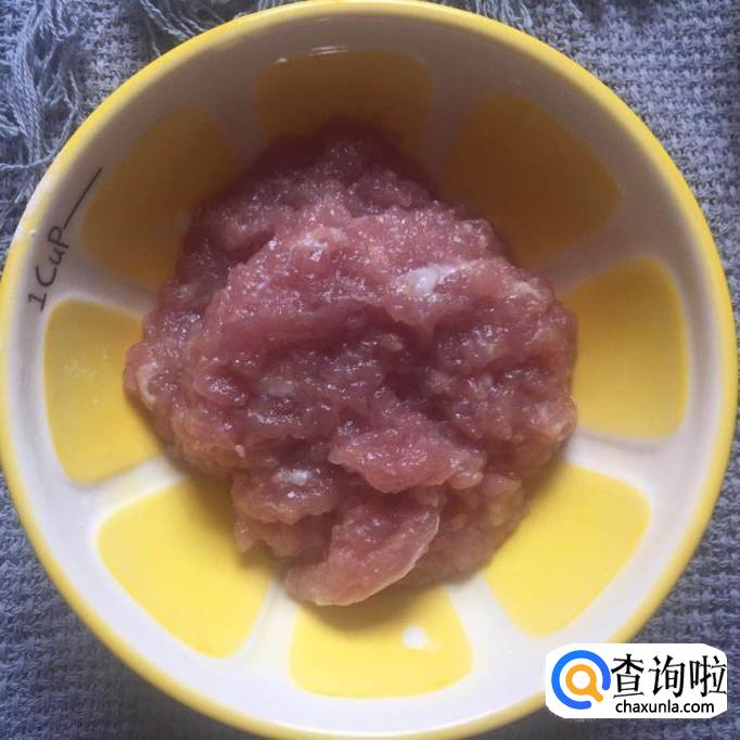 然后把剁好的肉泥用适量的酱油,老酒,蒜泥,香葱,盐巴,味精,五香粉腌制15分钟,如下图所示。