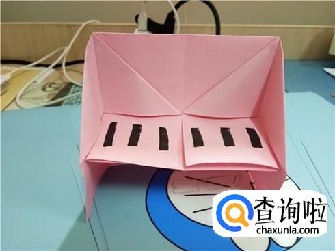 最后,我们将这两个正方形轻轻的抬起来并且将旁边的两部分也顺势折过来,用固体胶或者双面胶将折过来的部分与两个小正方形的边固定好,这样一个属于自己的钢琴就折好了。