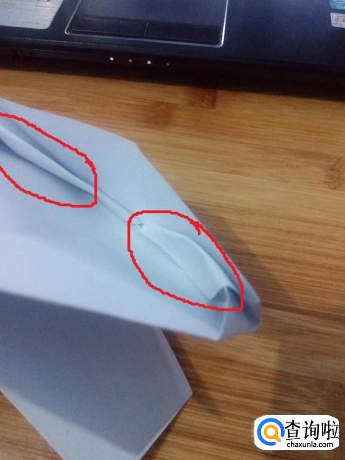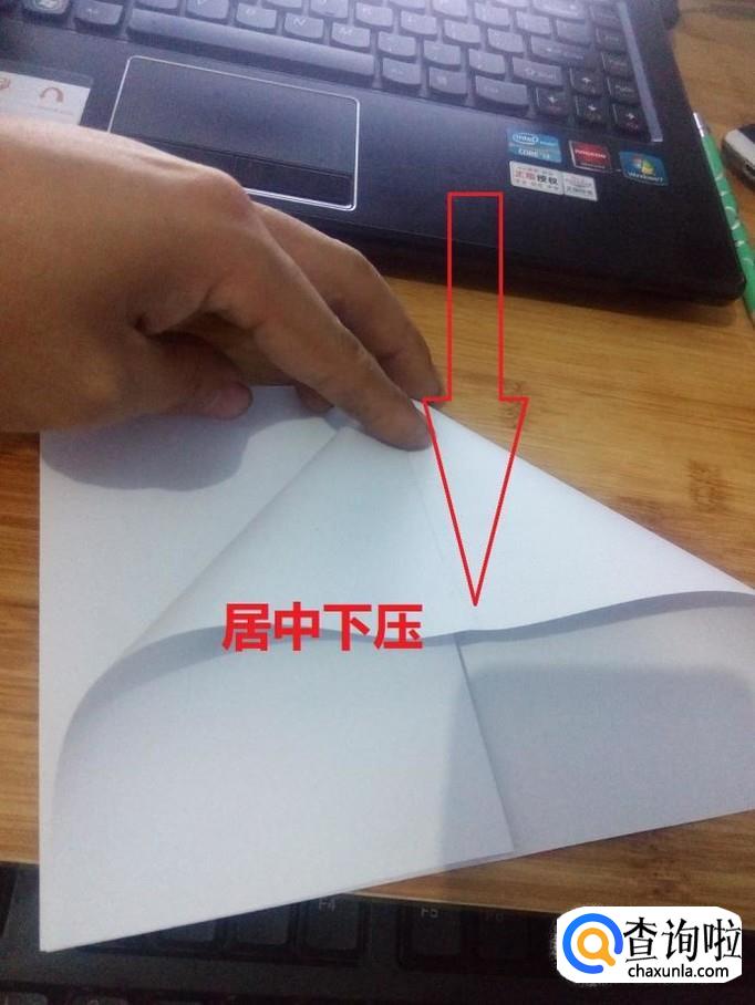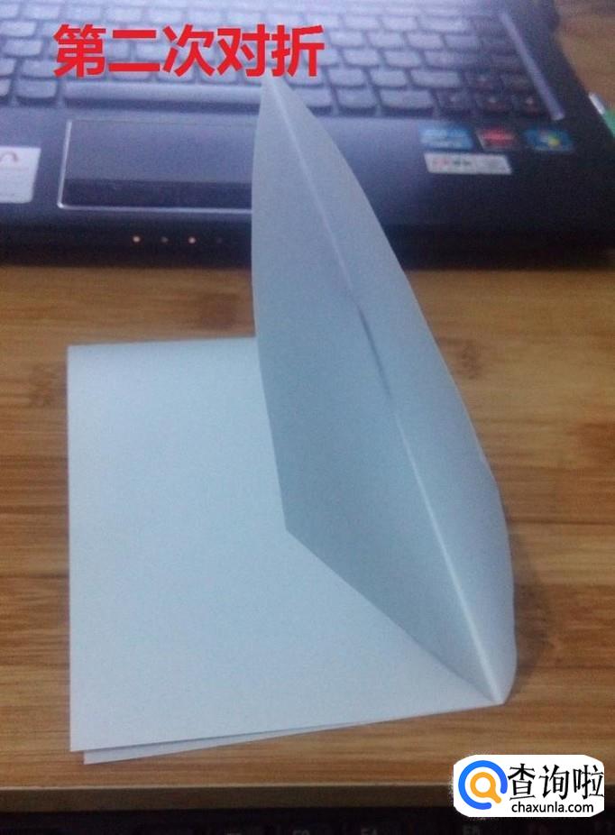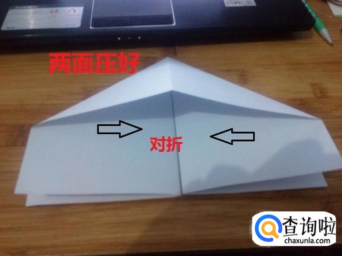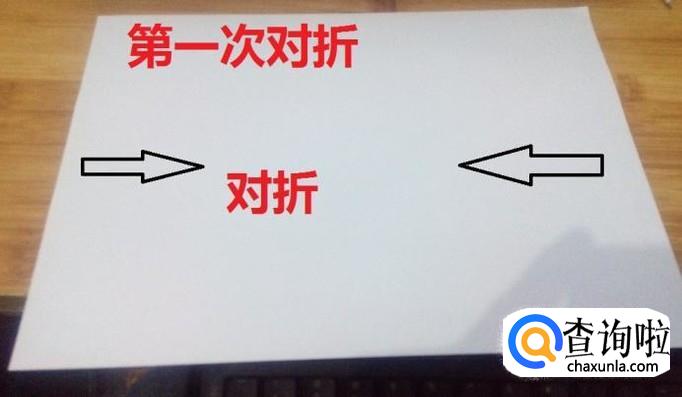 把有开口一侧的纸,中线对齐压平。两面都要压平。然后把压平的纸对折起来。