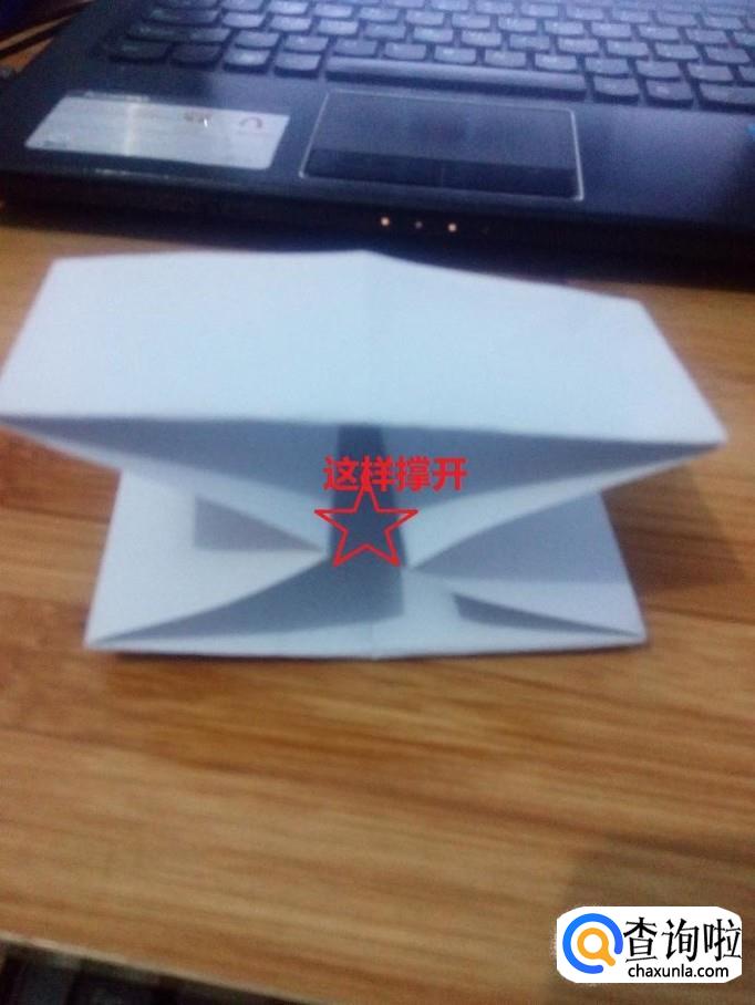 把四个里面的角,反塞进各自里面的三角形里,压平。正过来,把开口向四个方向均匀打开。